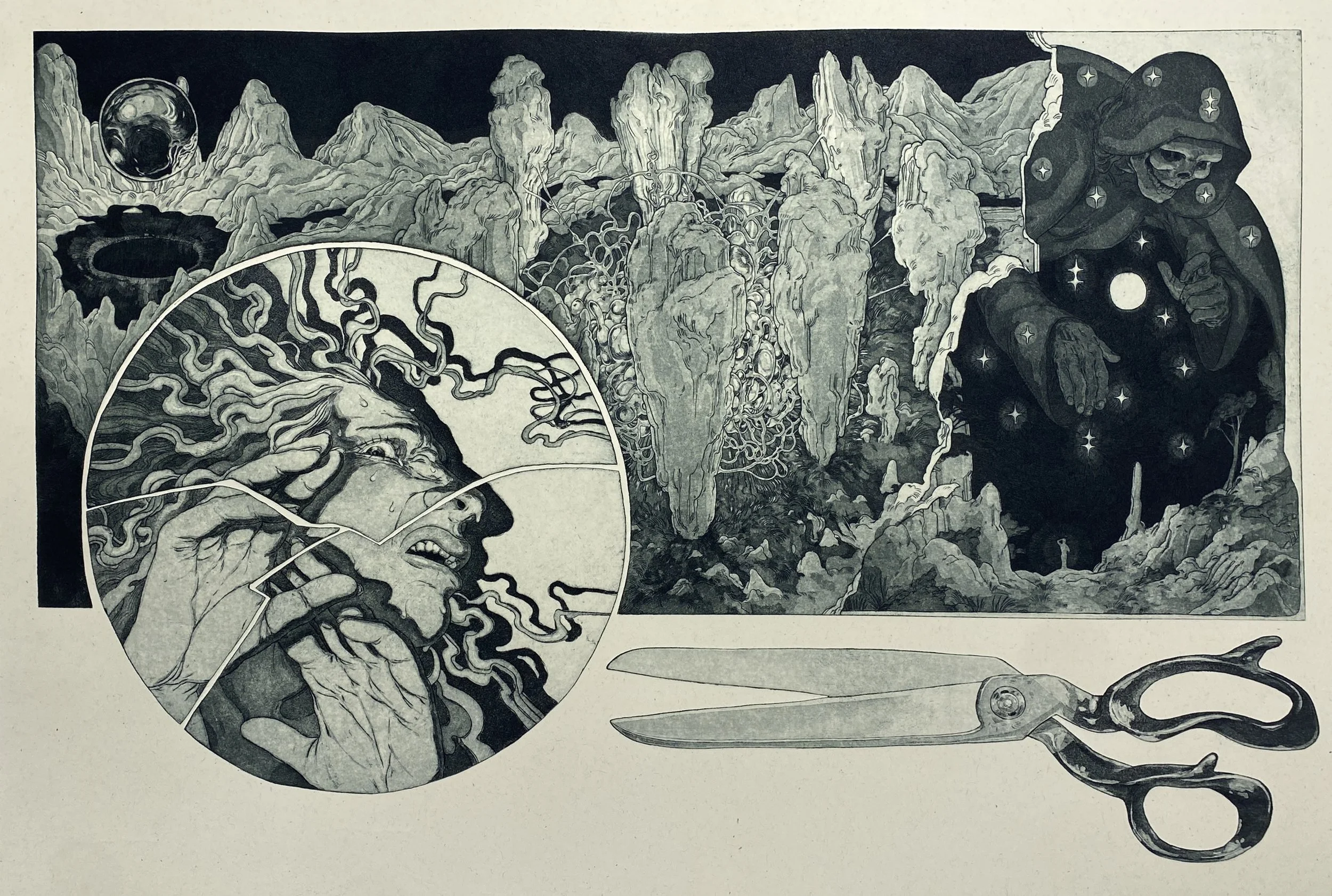 Intaglio etching made up of 5 hand cut copper plates.